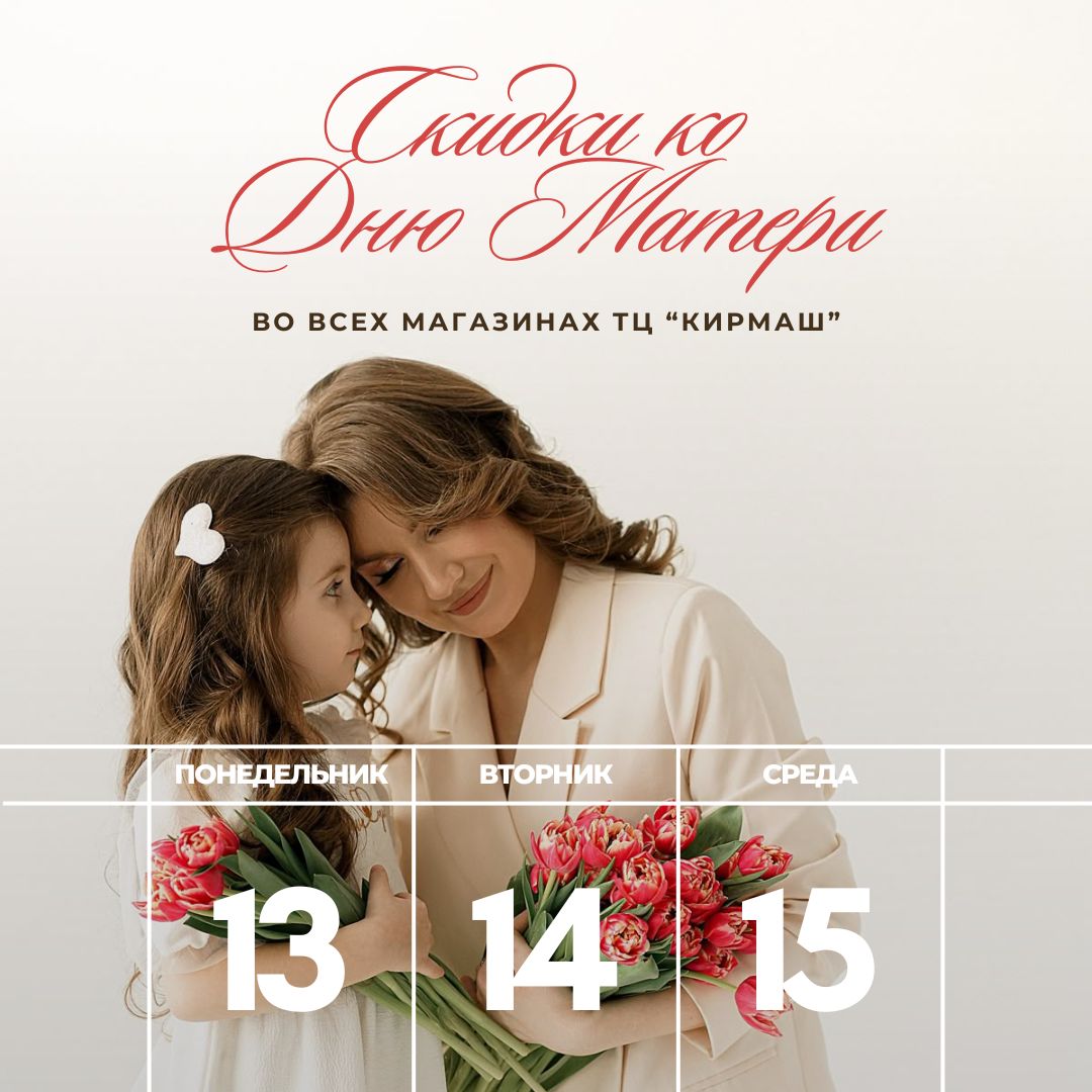С ЛЮБОВЬЮ К МАМАМ! ❤️ В ТЦ «КИРМАШ» в ПОНЕДЕЛЬНИК, ВТОРНИК и СРЕДУ — ПОВЫШЕННЫЕ СКИДКИ КО ДНЮ МАТЕРИ! ❤️