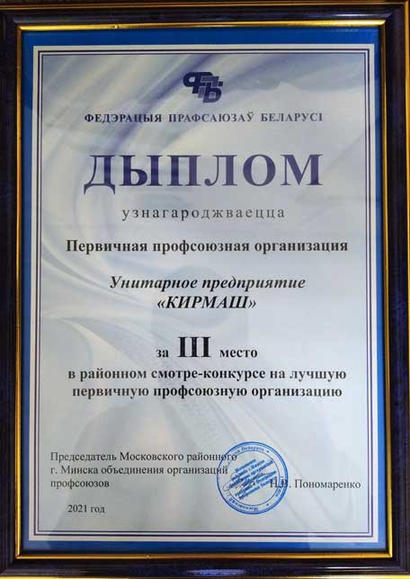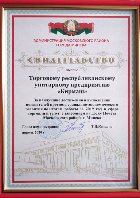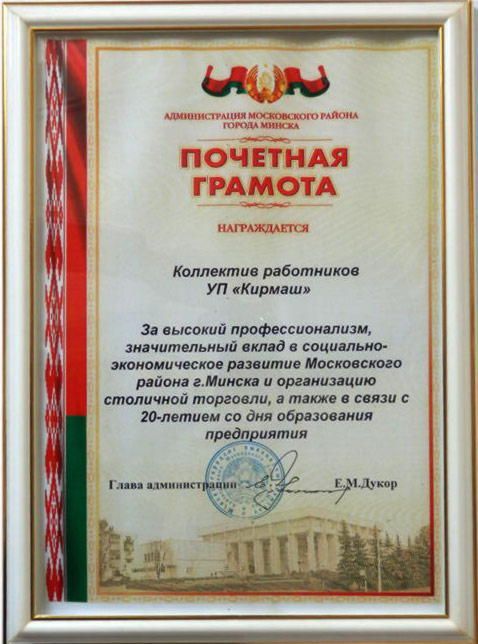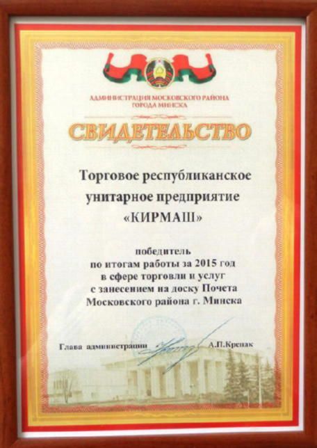 В 2020 году УП "Кирмаш" награжден свидетельством Администрации Московского района за наилучшие достижения в выполнении показателей прогноза социально-экономического развития по итогам работы за 2019 год в сфере торговли и услуг с занесением на доску Почета Московского района г. Минска.
