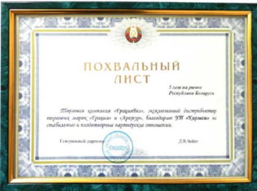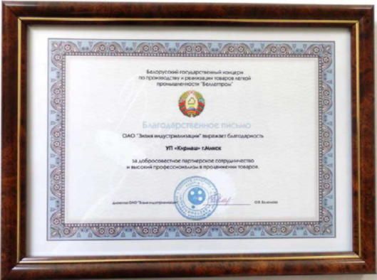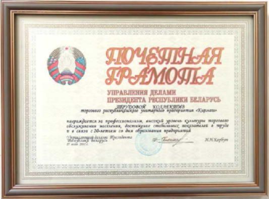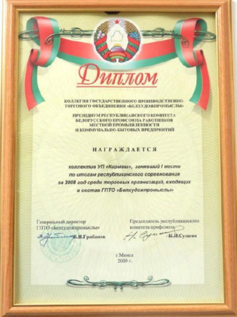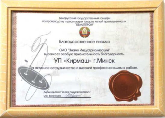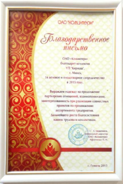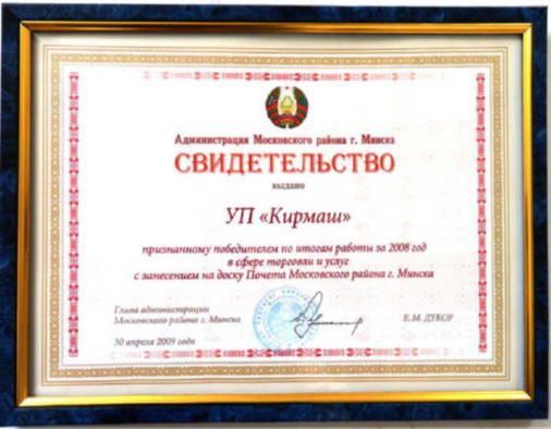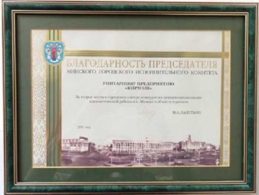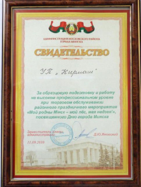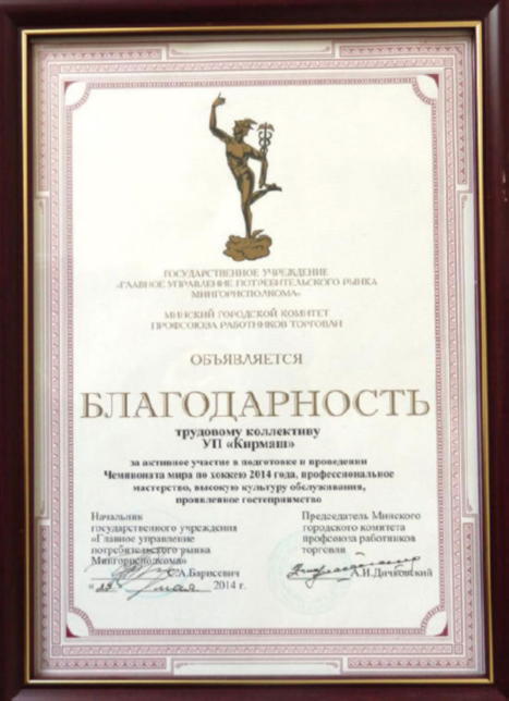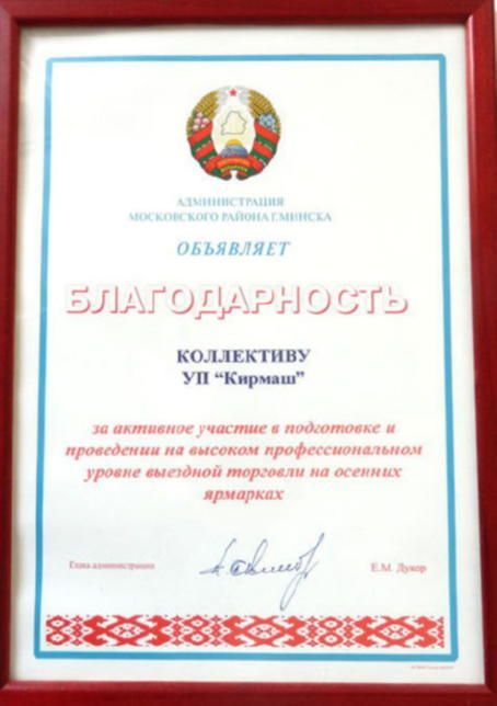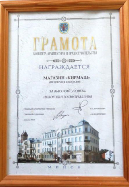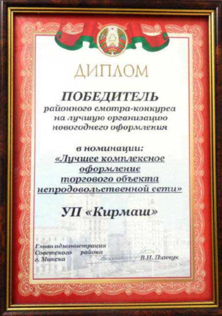 УП «Кирмаш» также был отмечен благодарственным письмом Мингорисполкома за победу в городском смотре-конкурсе на лучшую подготовку к празднованию Нового 2006 года среди крупных объектов торговли.