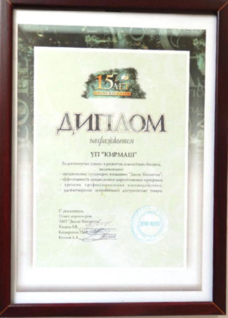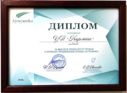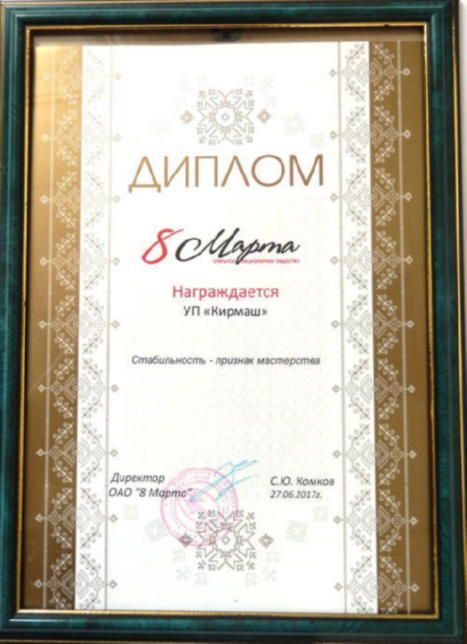 В сентябре 2009 года директор УП "Кирмаш" Богданова Л. Н. награждена медалью за трудовые заслуги.
