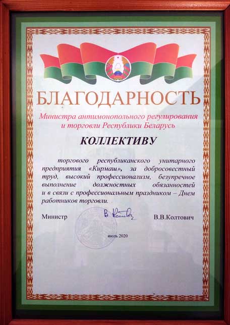 2020 год – в преддверии Дня работников торговли мы отмечены Благодарностью Министерства антимонопольного регулирования и торговли.