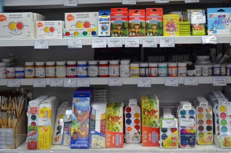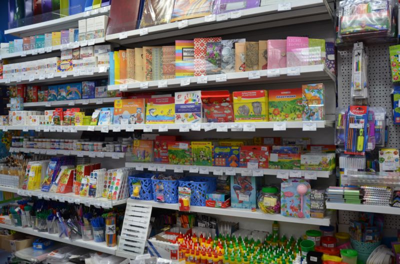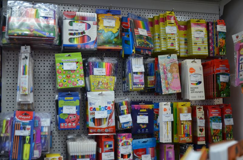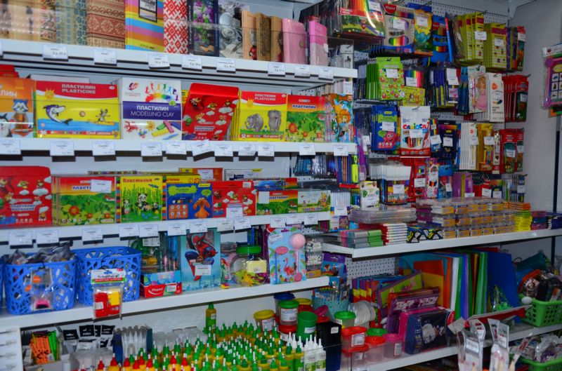 - Школьно-письменные товары: дневники, прописи, расскраски, тетради, ручки, карандаши, фломастеры, мелки школьные, пеналы, обложки, линейки, краски, кисти, альбомы и блоки для рисования и черчения, маркеры, папки, доски для лепки, глобусы, цветная бумага и др.