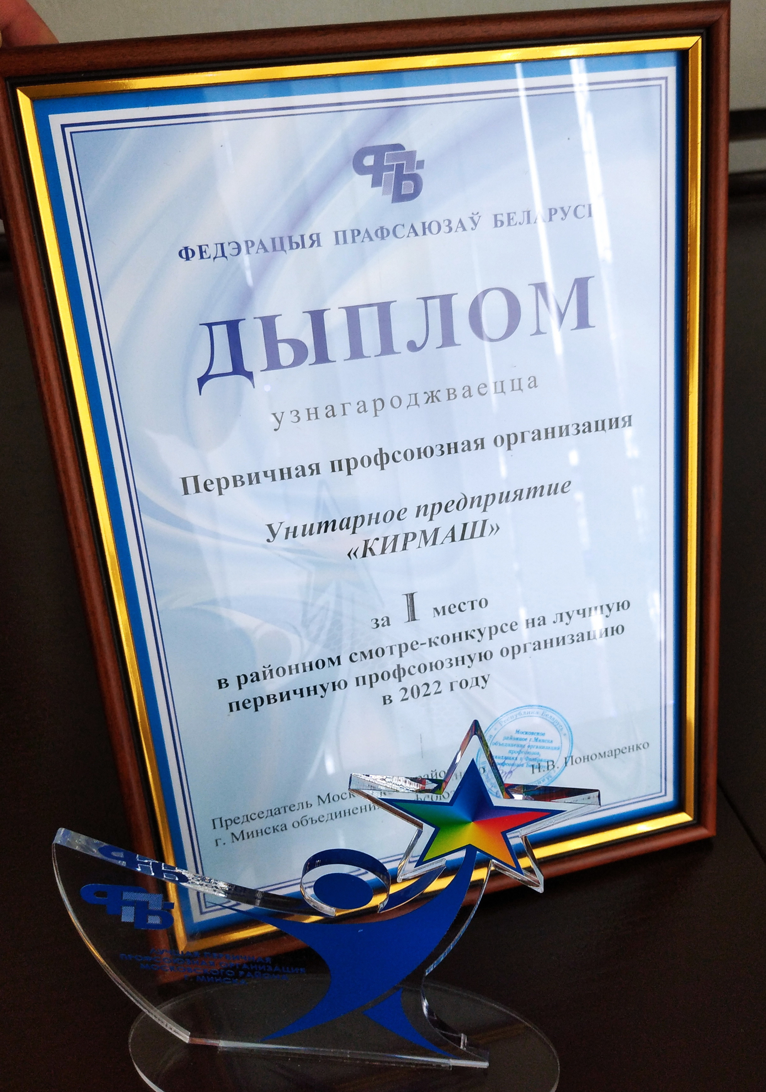 По итогам 2022 года первичная профсоюзная организация УП «Кирмаш» получила диплом, заняв 1 место в районном смотре-конкурсе по организации профсоюзной деятельности (Московский район г.Минска).