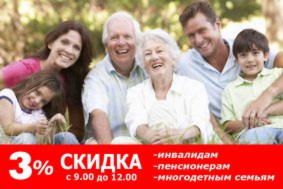 Скидка предоставляется ежедневно при предъявлении удостоверения многодетной матери, инвалида, пенсионера или паспорта. Скидка не распространяется на товары с ценой менее 3 рубля, уцененные товары, акционные, конфискат. Скидки не суммируются.