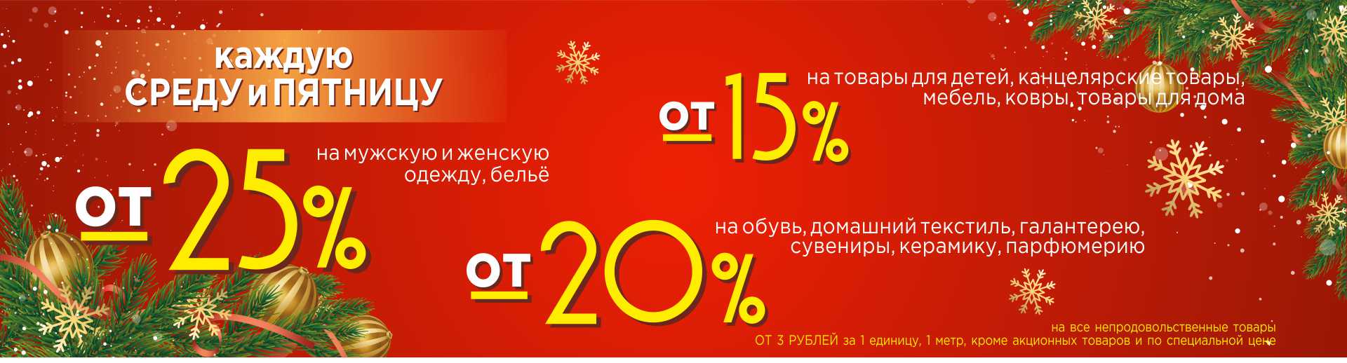 А чтобы предложения были еще более привлекательными, каждую среду и пятницу у нас действуют отличные скидки: начиная от 25% на мужскую и женскую одежду, белье, и от 20% на обувь, домашний текстиль, галантерею, сувениры, керамику и даже парфюмерию. Если у вас есть дети, то обратите внимание на товары для них - вы сможете приобрести их со скидкой от 15%. А для тех, кто любит творчество или нуждается в офисных принадлежностях, у нас есть скидки от 15% на канцелярские товары. Также не забывайте про мебель, ковры и товары для дома - на них действует скидка от 15%.