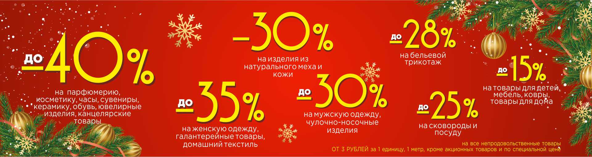 Каждый день у вас есть возможность сэкономить до 40% на следующих категориях товаров: парфюмерия, косметика, часы, сувениры, керамика, обувь, ювелирные изделия и канцелярские товары. А это еще не все! До 35% скидки на женскую одежду, галантерейные товары и домашний текстиль. Не забывайте про наше отделение меха и кожи, где вы сможете приобрести товары со скидкой 30%. И это еще не все! Мужская одежда и чулочно-носочные изделия ждут вас с скидкой до 30%, а бельевой трикотаж - до 28%. Кстати, для тех, кто хочет обновить посуду на Новый год, у нас есть отличная новость - скидки до 25% на сковородки и посуду. И самое главное - если у вас есть дети, не забудьте заглянуть в отдел товаров для детей, где вас ждут скидки до 15% на все необходимое для малышей, а также на мебель, ковры и товары для дома.